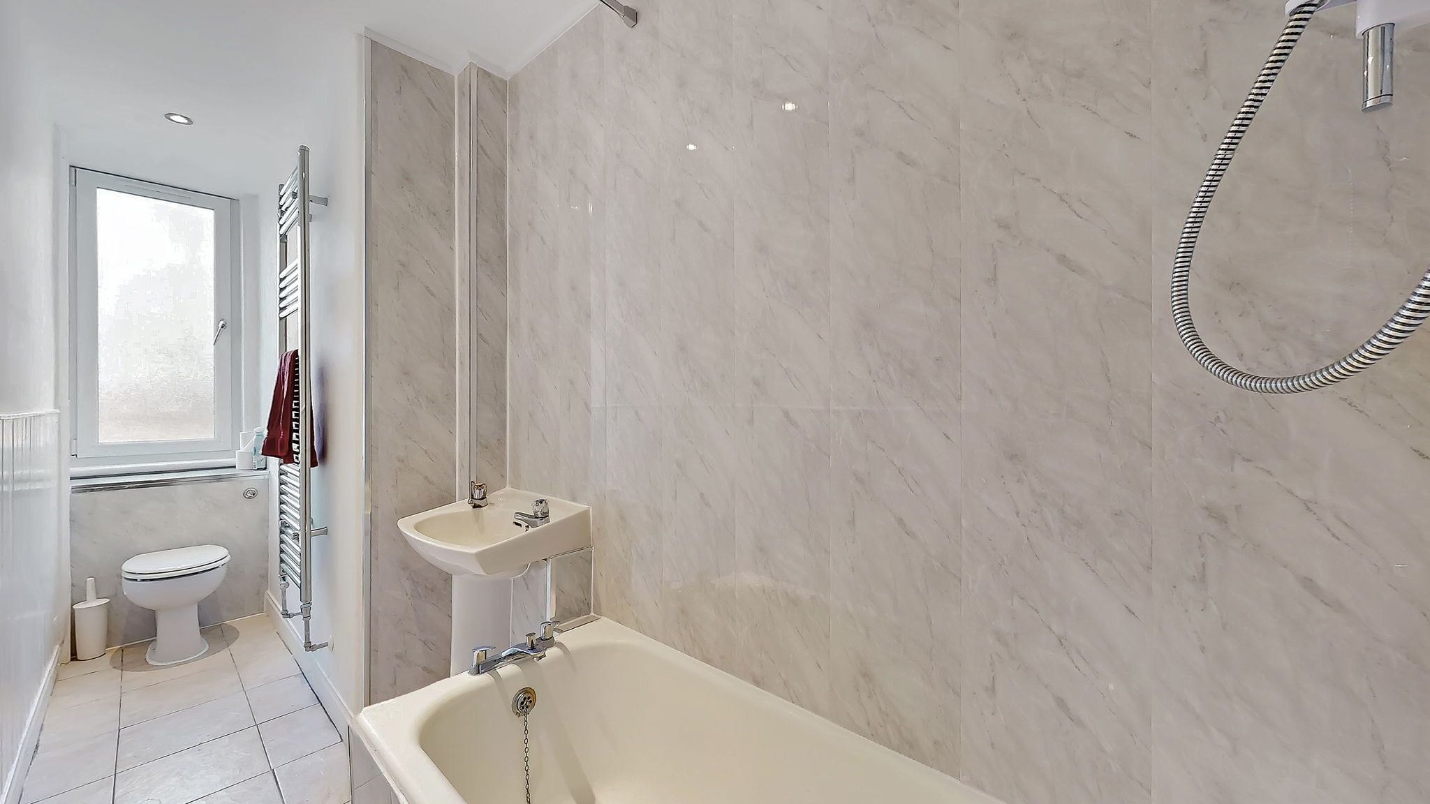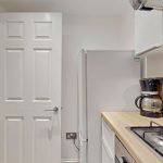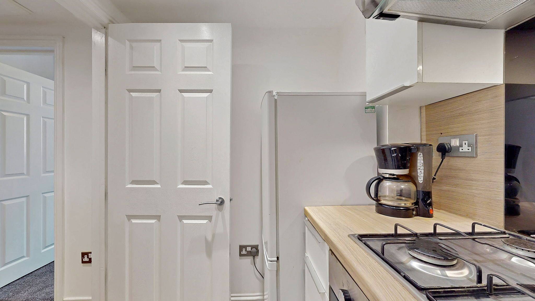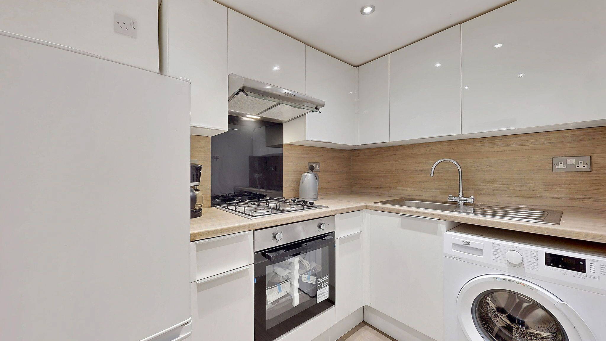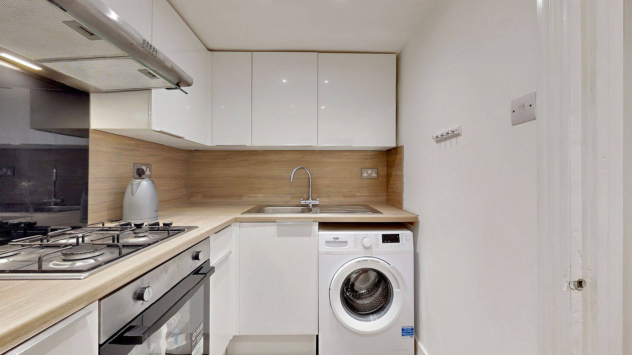 The kitchen is efficiently designed in a fresh, modern style, featuring white units complemented by wood effect worktops and matching splashback. Thoughtfully laid out to maximise space, it provides excellent storage and worktop area, along with a gas hob, extractor hood/fan (venting to the outside) and new electric oven. Kitchen appliances are completed with a washing machine and fridge/freezer, both included in the sale. Opposite the kitchen is a shallow alcove currently fitted with shelving and providing space for additional floor units or a small breakfast bar.