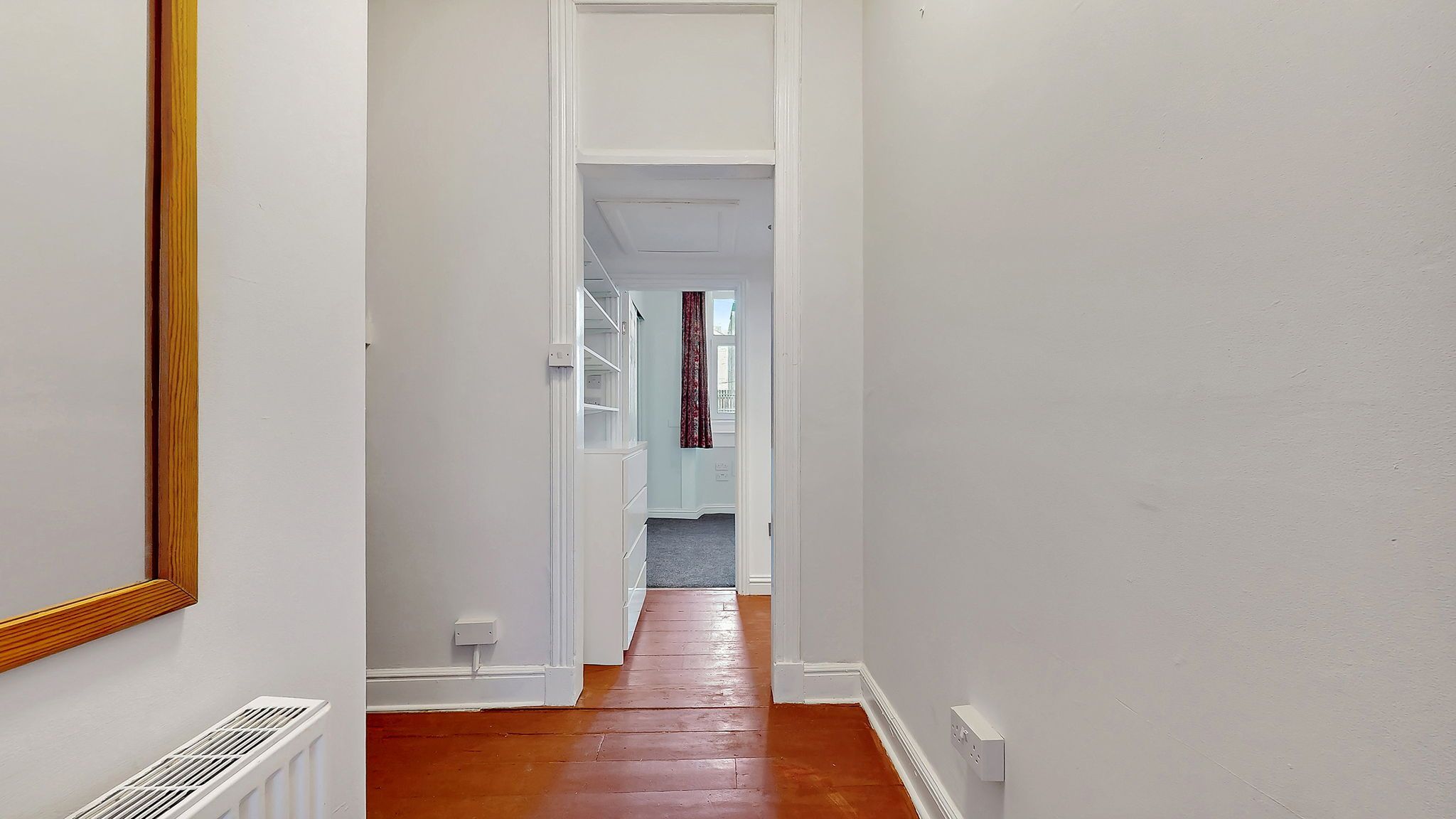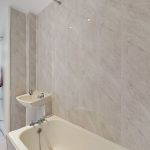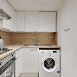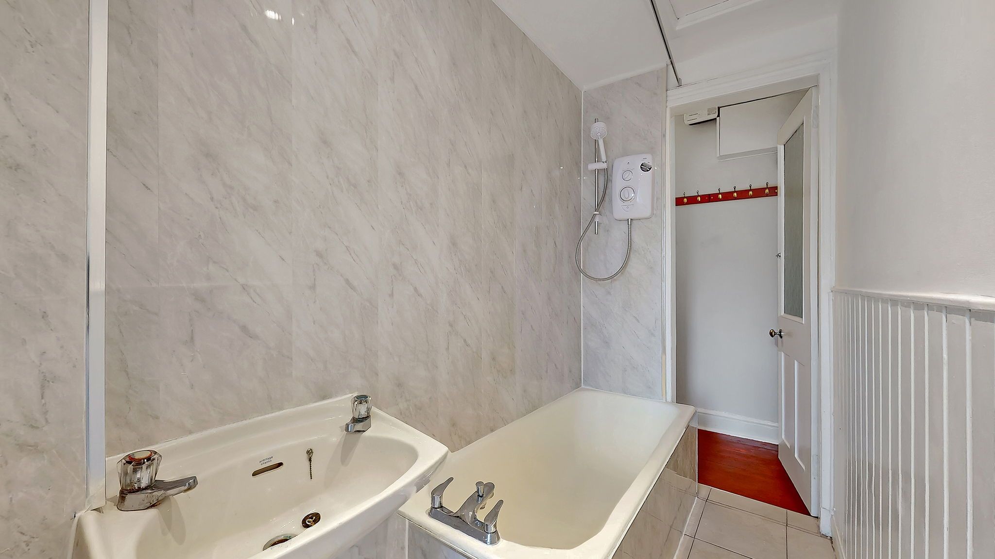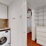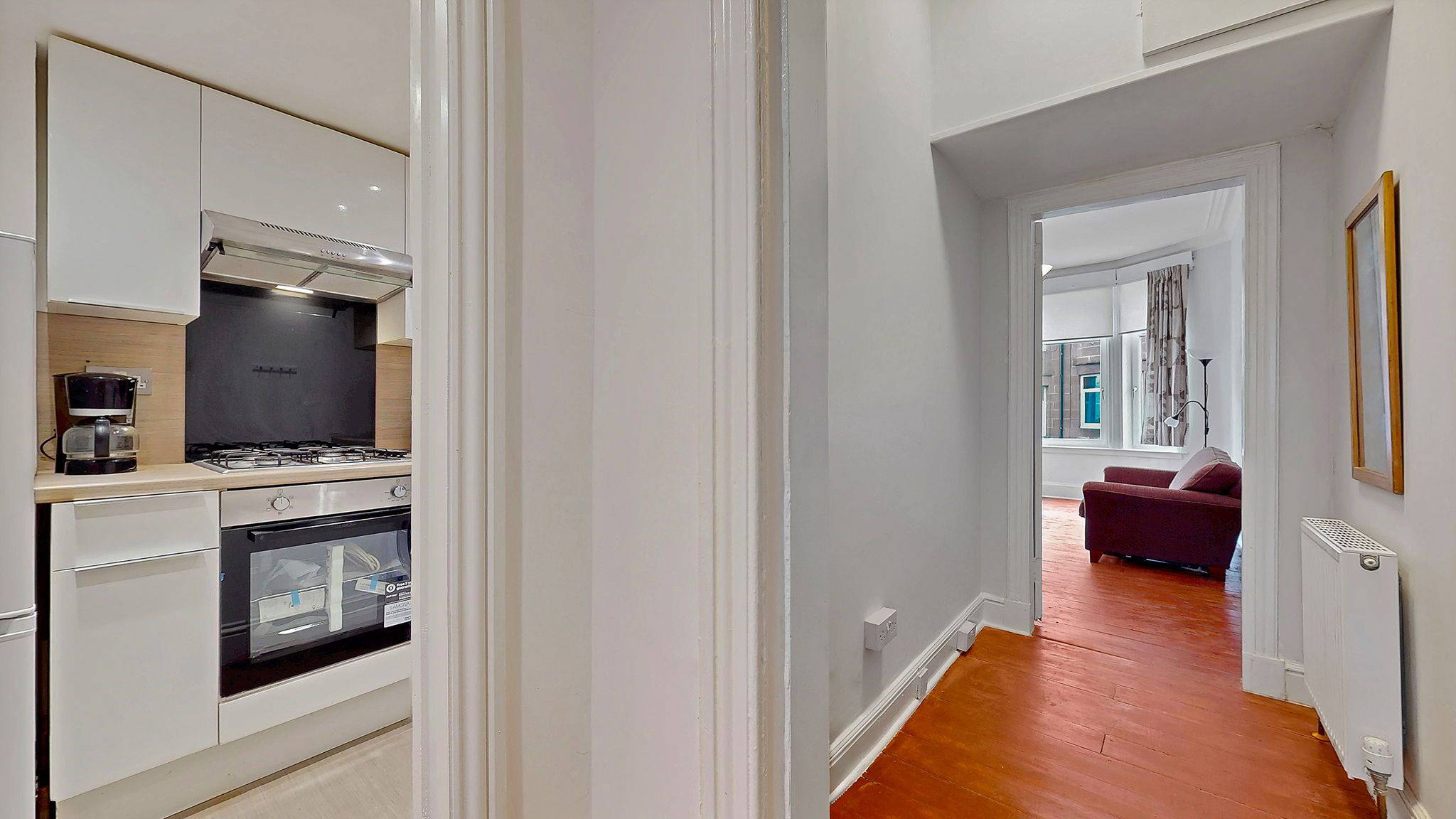 The kitchen is efficiently designed in a fresh, modern style, featuring white units complemented by wood effect worktops and matching splashback. Thoughtfully laid out to maximise space, it provides excellent storage and worktop area, along with a gas hob, extractor hood/fan (venting to the outside) and new electric oven. Kitchen appliances are completed with a washing machine and fridge/freezer, both included in the sale. Opposite the kitchen is a shallow alcove currently fitted with shelving and providing space for additional floor units or a small breakfast bar.