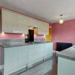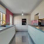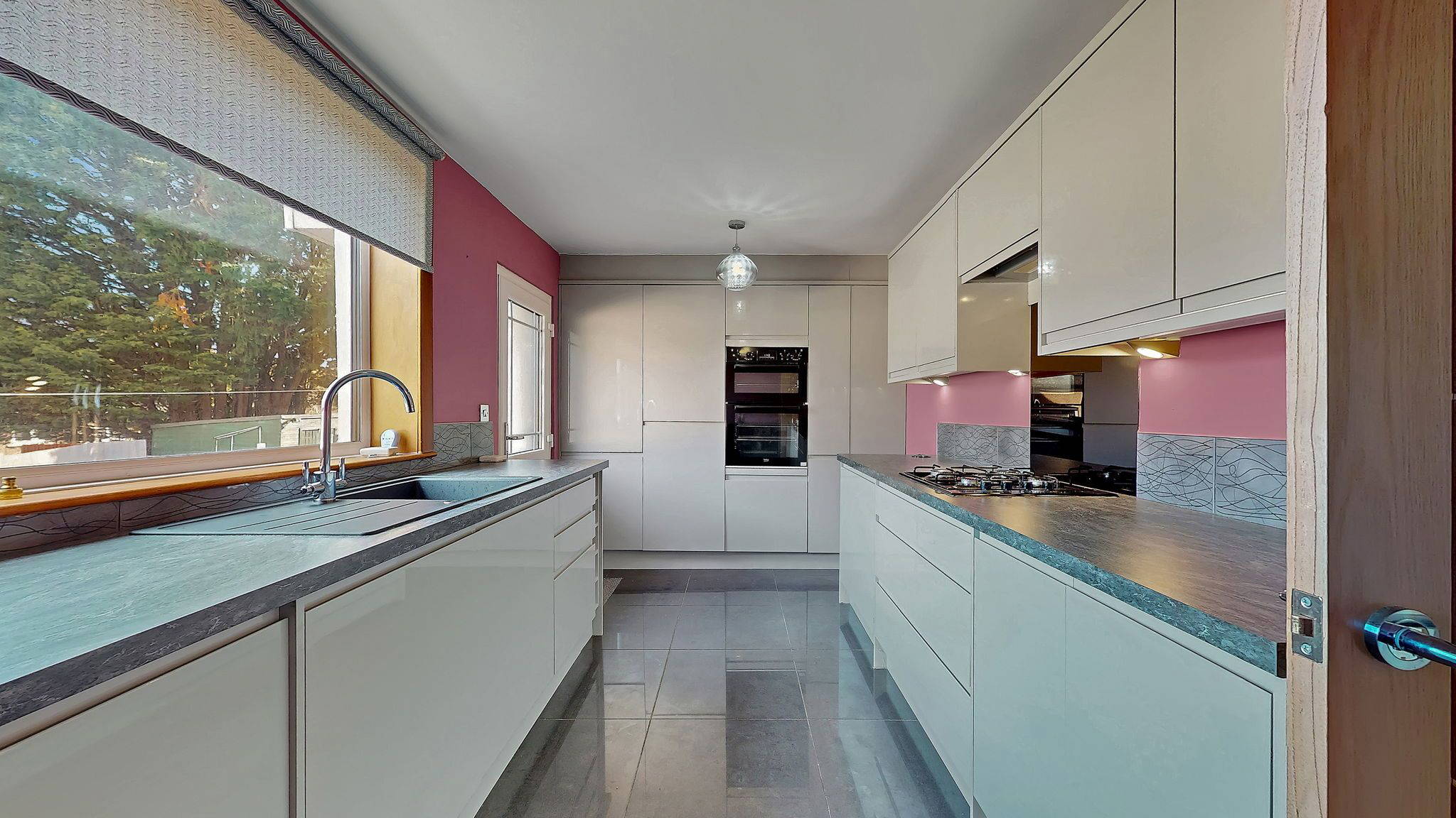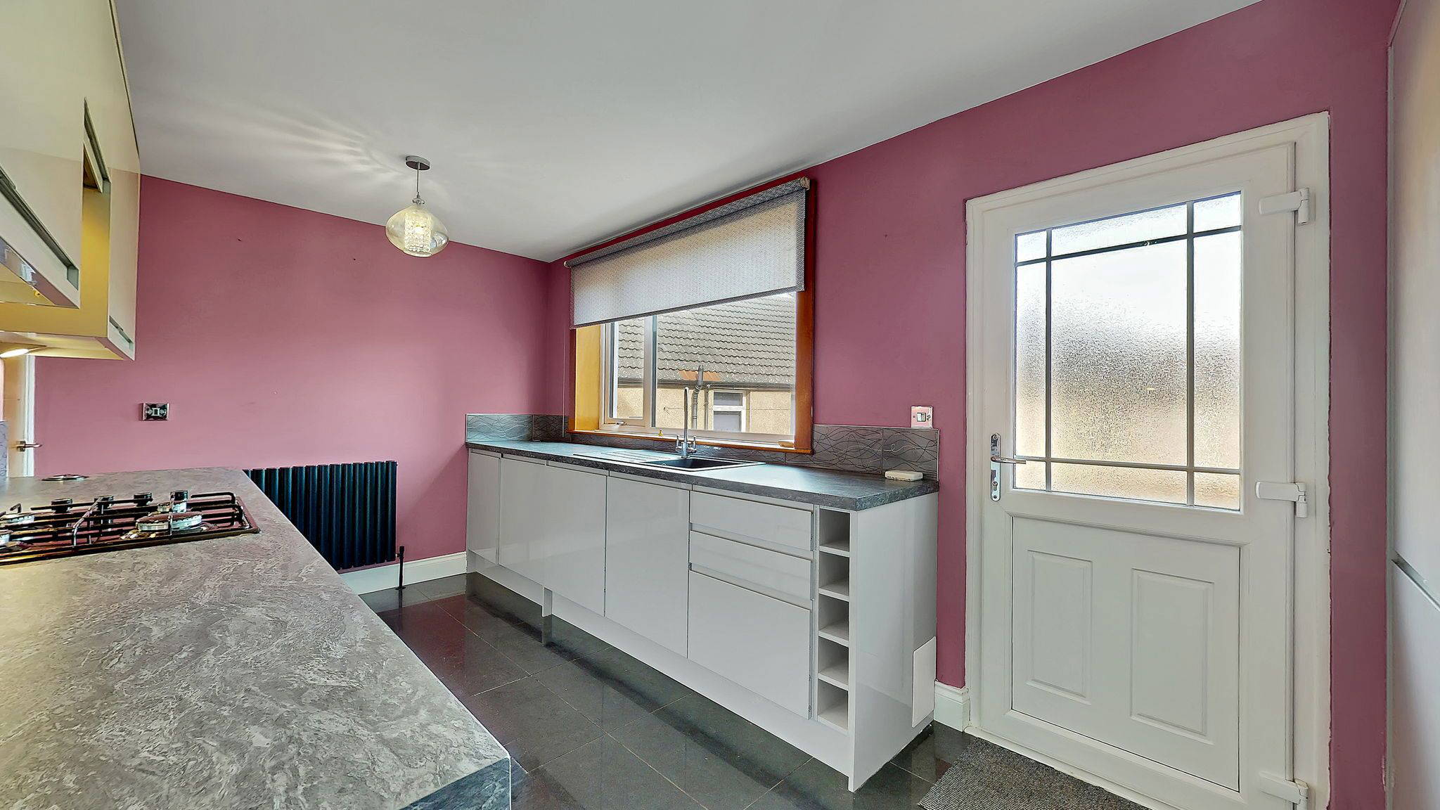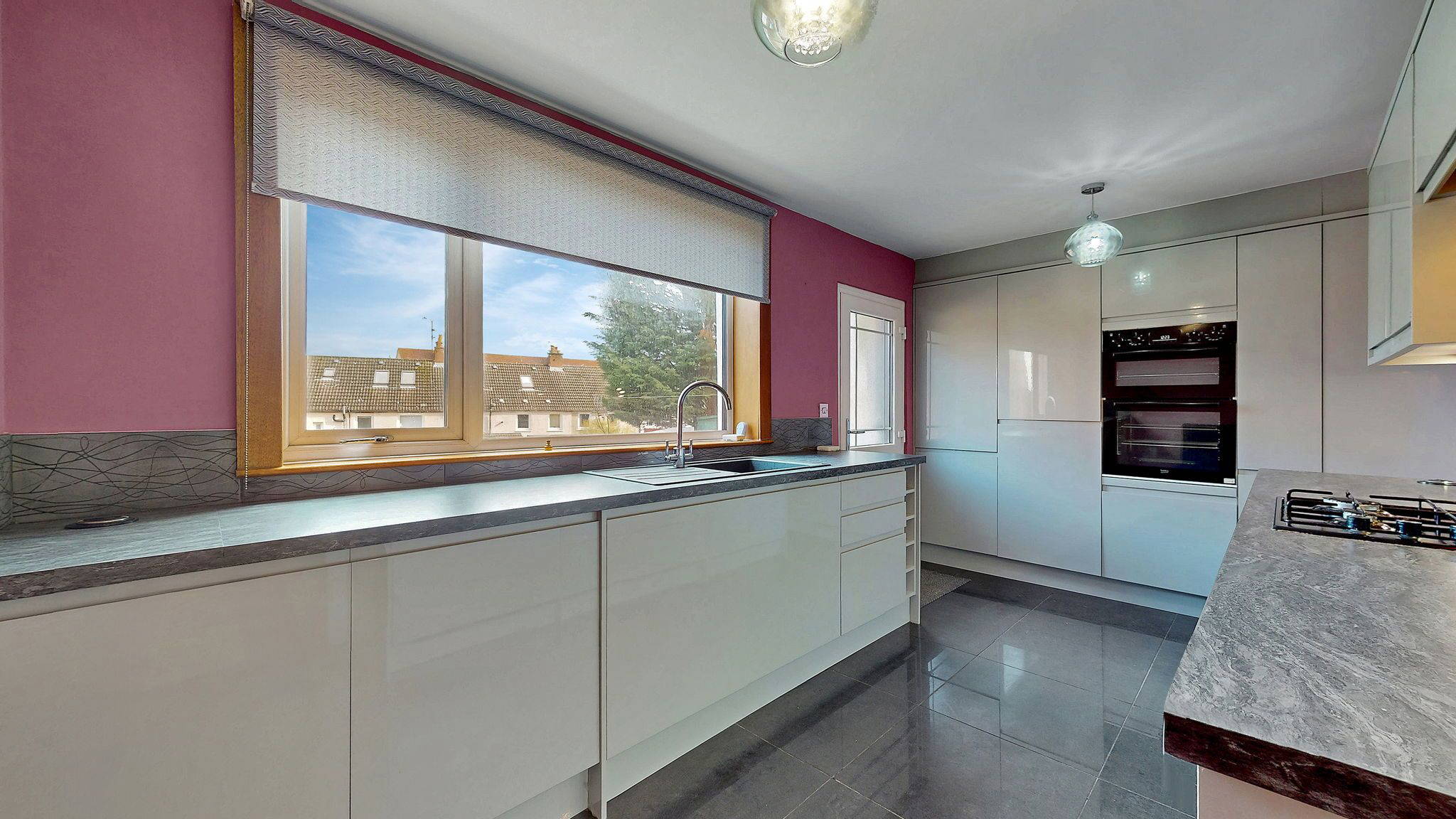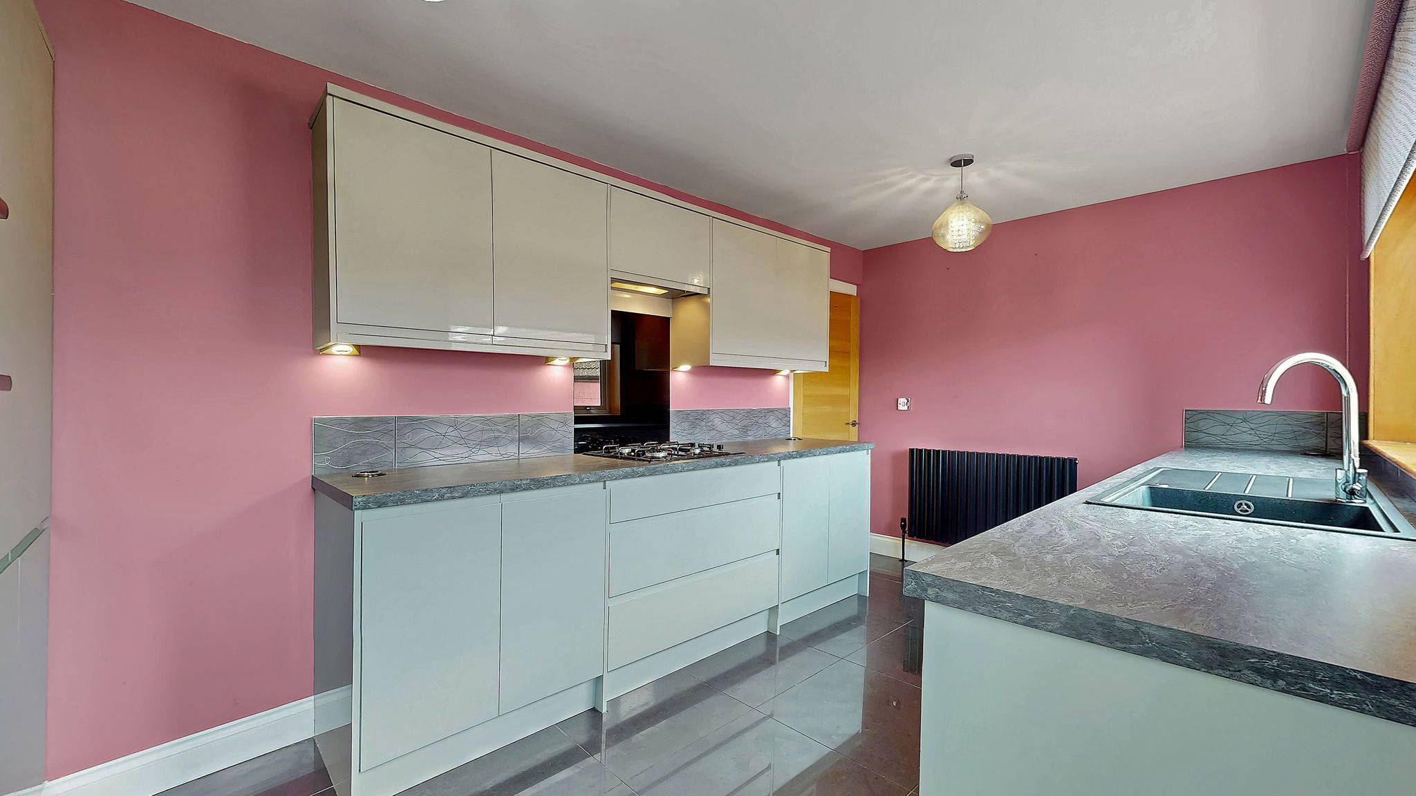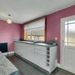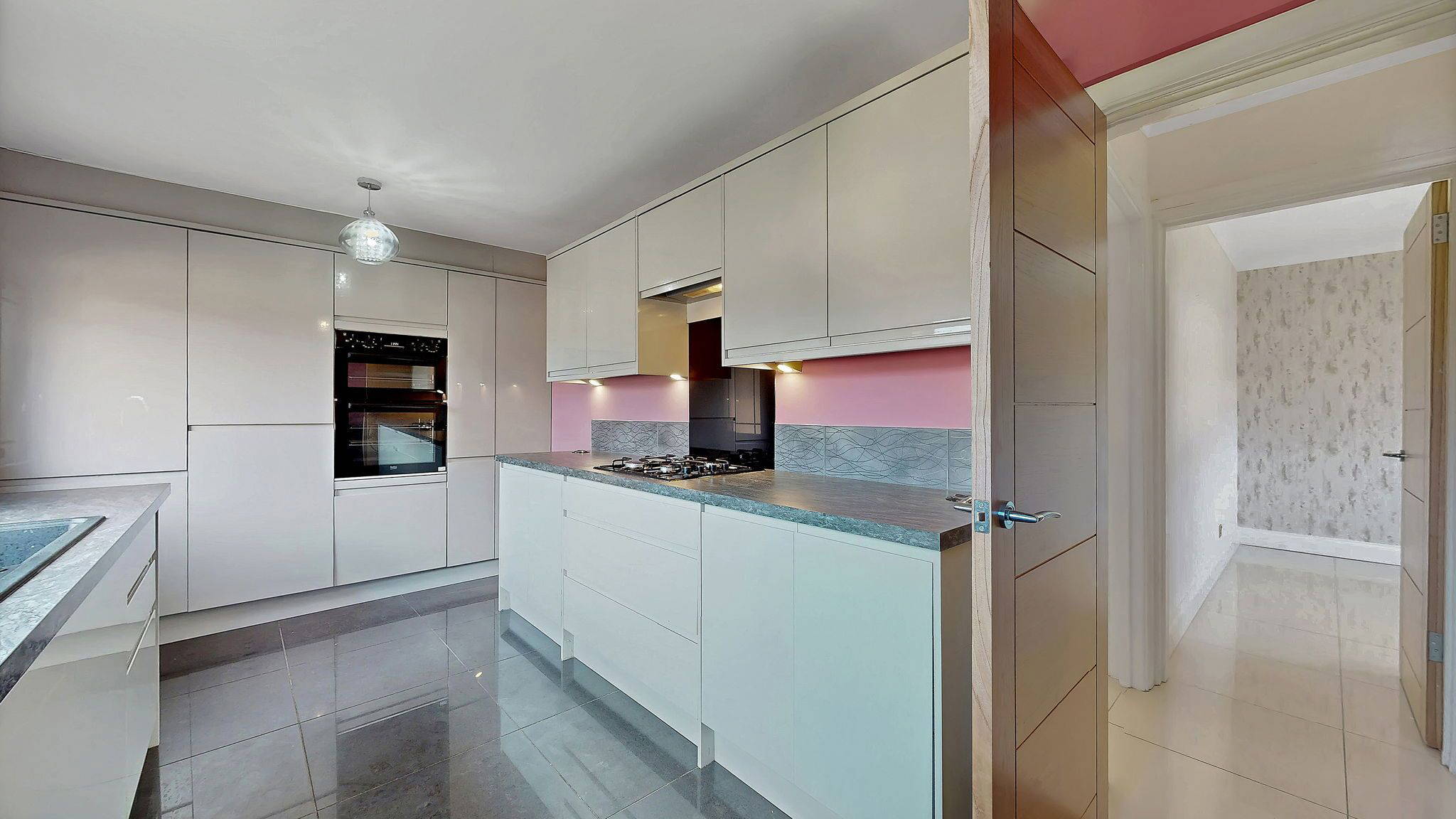 The accommodation begins with a welcoming entrance hallway, providing access to the principal apartments and creating a bright first impression. The living room is a spacious and inviting area, filled with natural light and offering ample room for both lounge and dining furniture, making it ideal for relaxing evenings or entertaining guests. To the rear, the kitchen is modern and thoughtfully laid out with a range of wall and floor mounted units, offering excellent storage and workspace, with direct access out to the rear garden for added convenience.