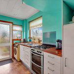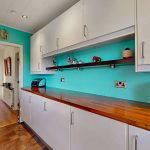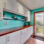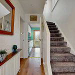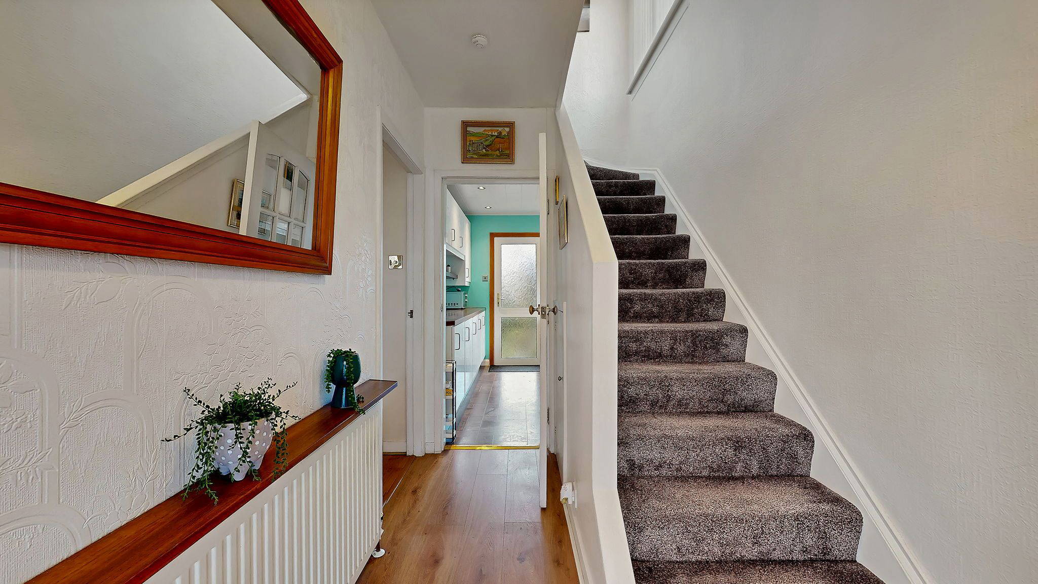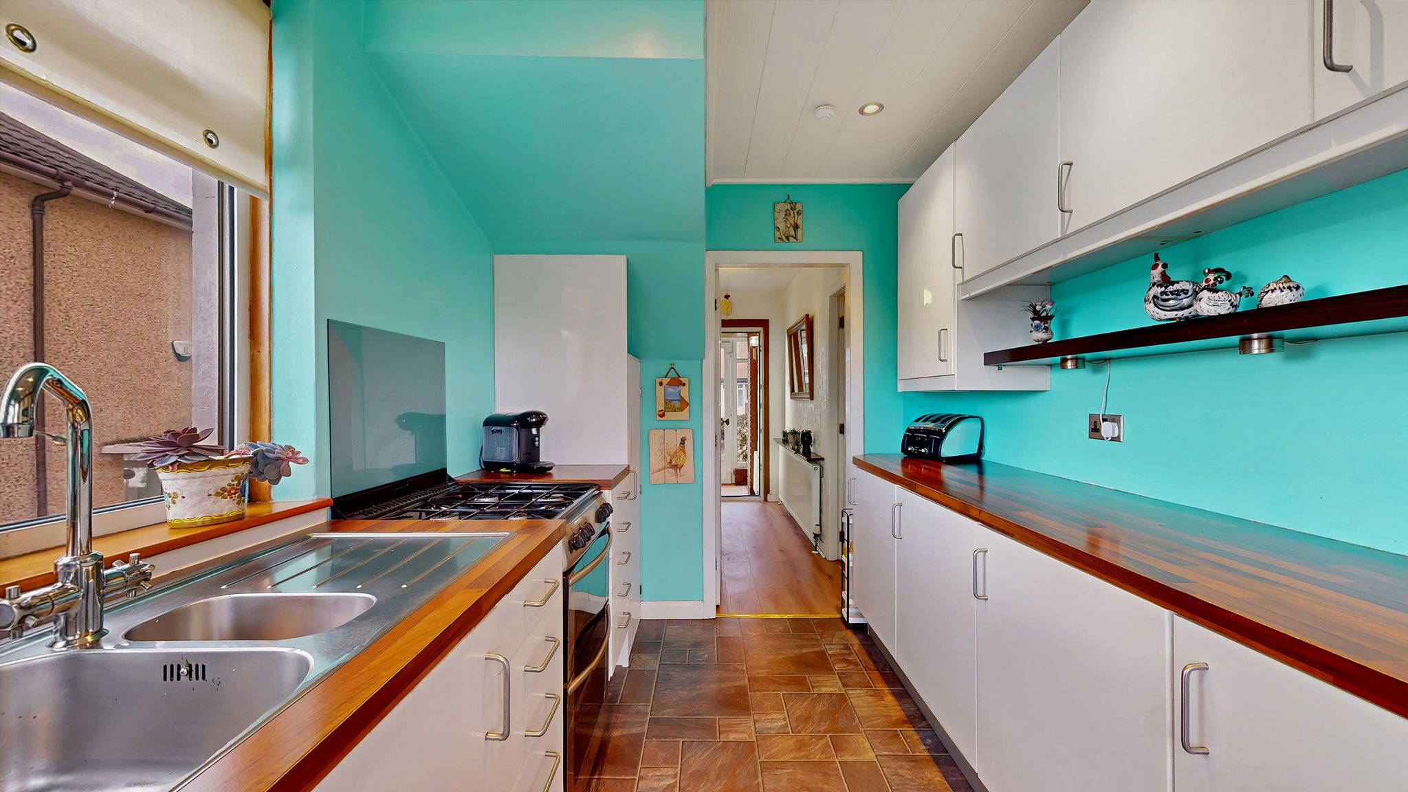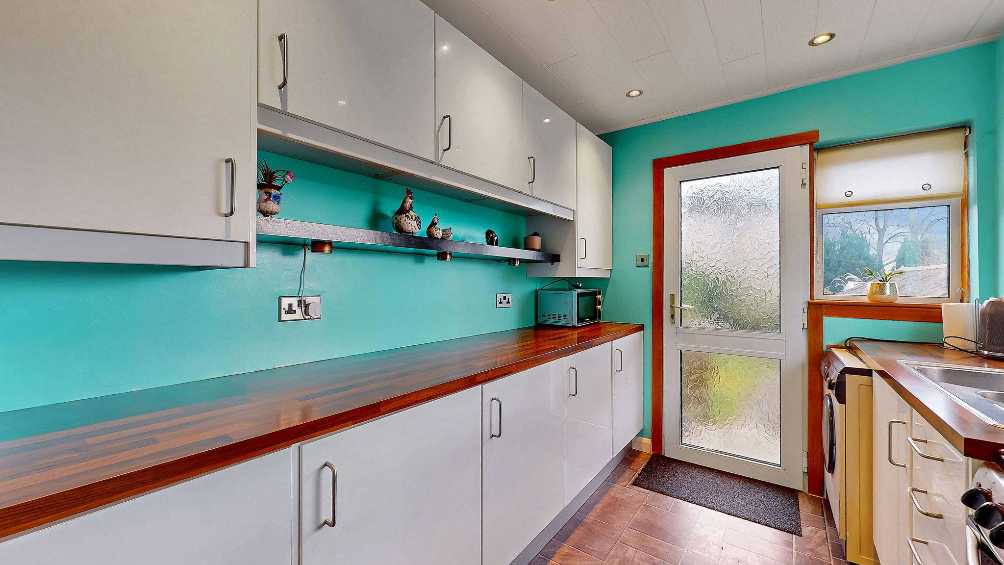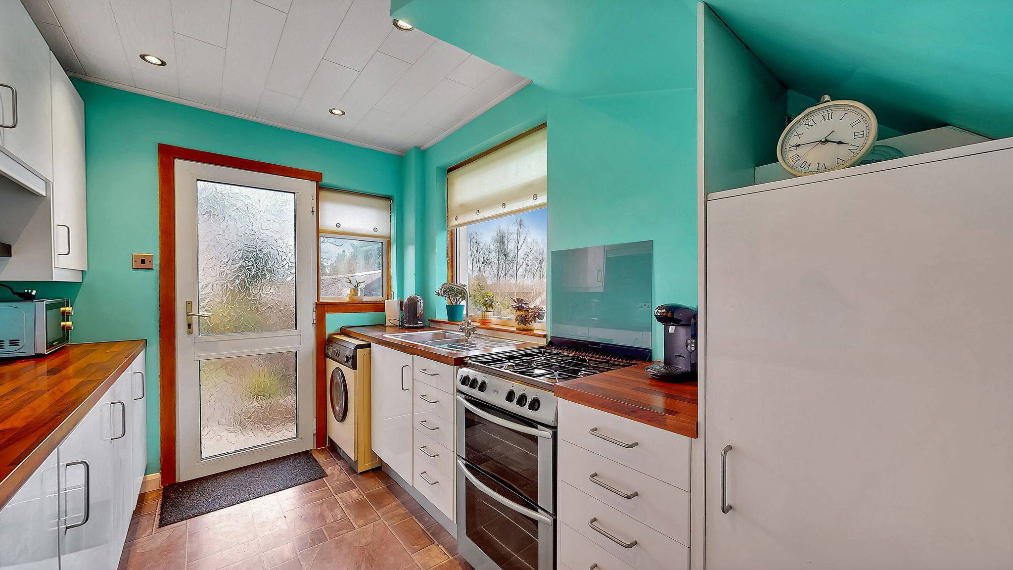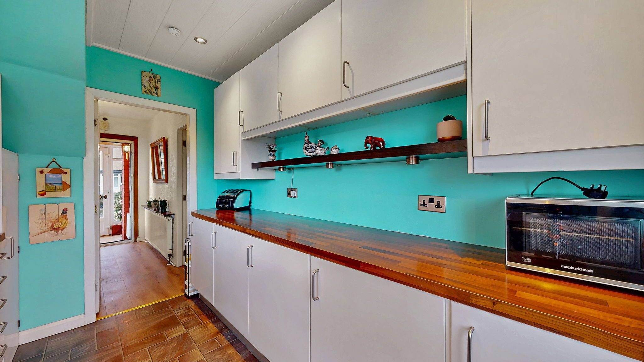The modern kitchen is fitted with stylish white units, complemented by wooden effect worktops, and offers ample storage and workspace for cooking and dining. There is also the added benefit of useful storage on the ground floor, enhancing the practicality of the home.