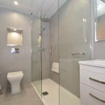 First floor: deep storage cupboard on landing, three double bedrooms, modern fitted shower room comprising three piece suite with full height wet wall panelling, ceiling lined in PVC with recessed downlights.