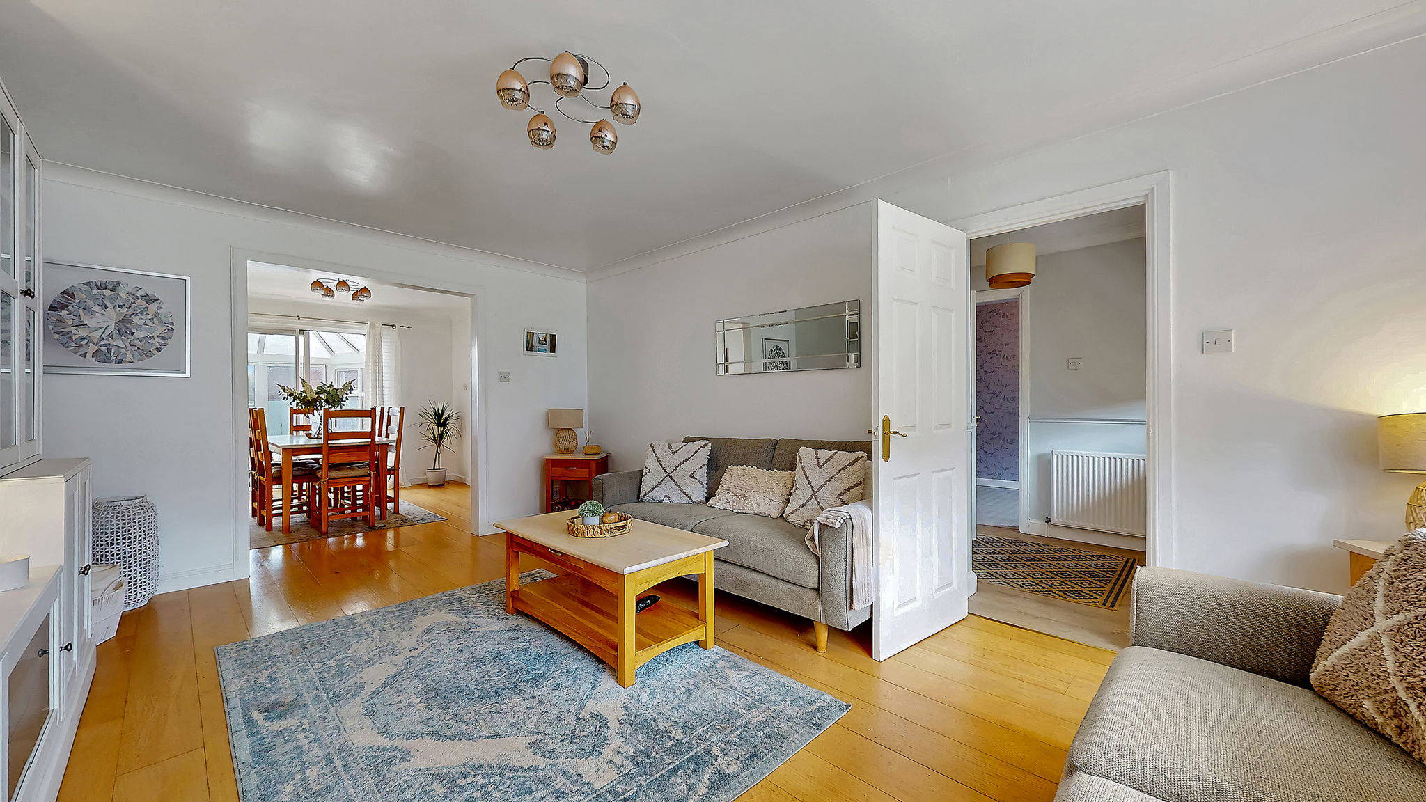 The ground floor opens with a welcoming entrance hall leading into a bright and spacious living room, perfect for relaxing and entertaining. A separate dining room provides an ideal setting for formal meals, while an additional sitting room offers further flexibility for family living or a cosy retreat. The well appointed kitchen is complemented by a useful utility room, enhancing everyday practicality, and flows into a delightful conservatory overlooking the rear garden. A convenient WC apartment completes the ground floor accommodation.