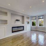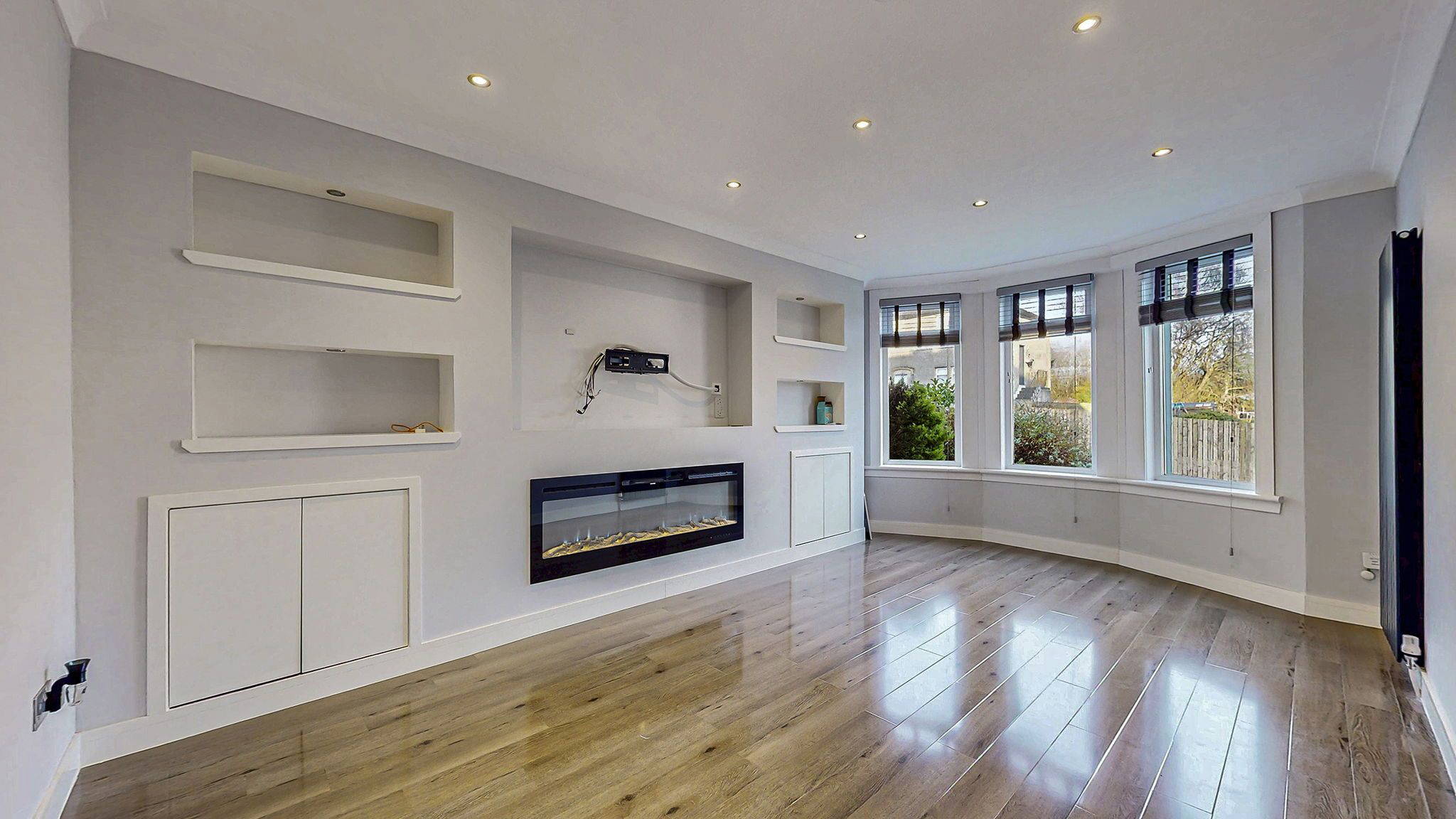 high standard and features an electric fireplace built into a stylish media effect feature wall, creating an attractive focal point and a warm, contemporary living space.
