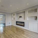 high standard and features an electric fireplace built into a stylish media effect feature wall, creating an attractive focal point and a warm, contemporary living space.