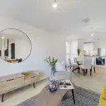 Living room and dining space allow for increased circulation space